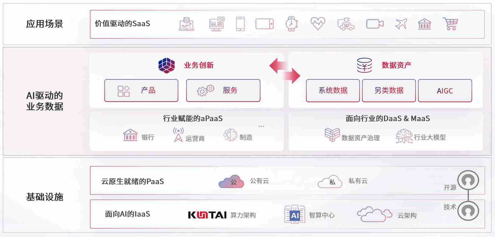 数字时代,,,,围绕企业数字化转型的关键要素,,,,z6com尊龙数码开创性的提出数云融合战略和技术体系框架,,,,着力在云原生、、、、数字原生、、AI原生和信创产业上架构产品和服务能力,,,,为处在不同数字化转型阶段的快消零售、、、汽车、、金融、、、医疗、、、、政企、、教育、、运营商等行业客户提供泛在的敏捷IT能力和融合的数据驱动能力,,构建跨界融合创新的数字业务场景和新业务模式,,,助力企业级客户建立面向未来的核心能力和竞争优势,,,全面推动社会的数字化、、智能化转型升级。。